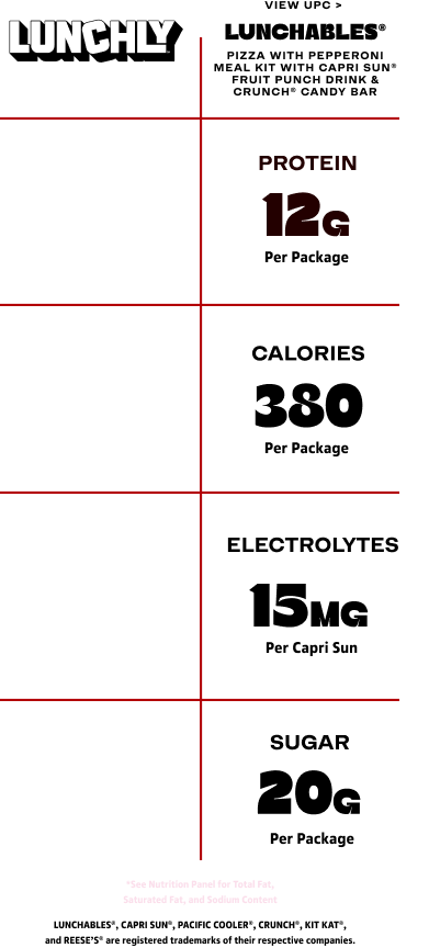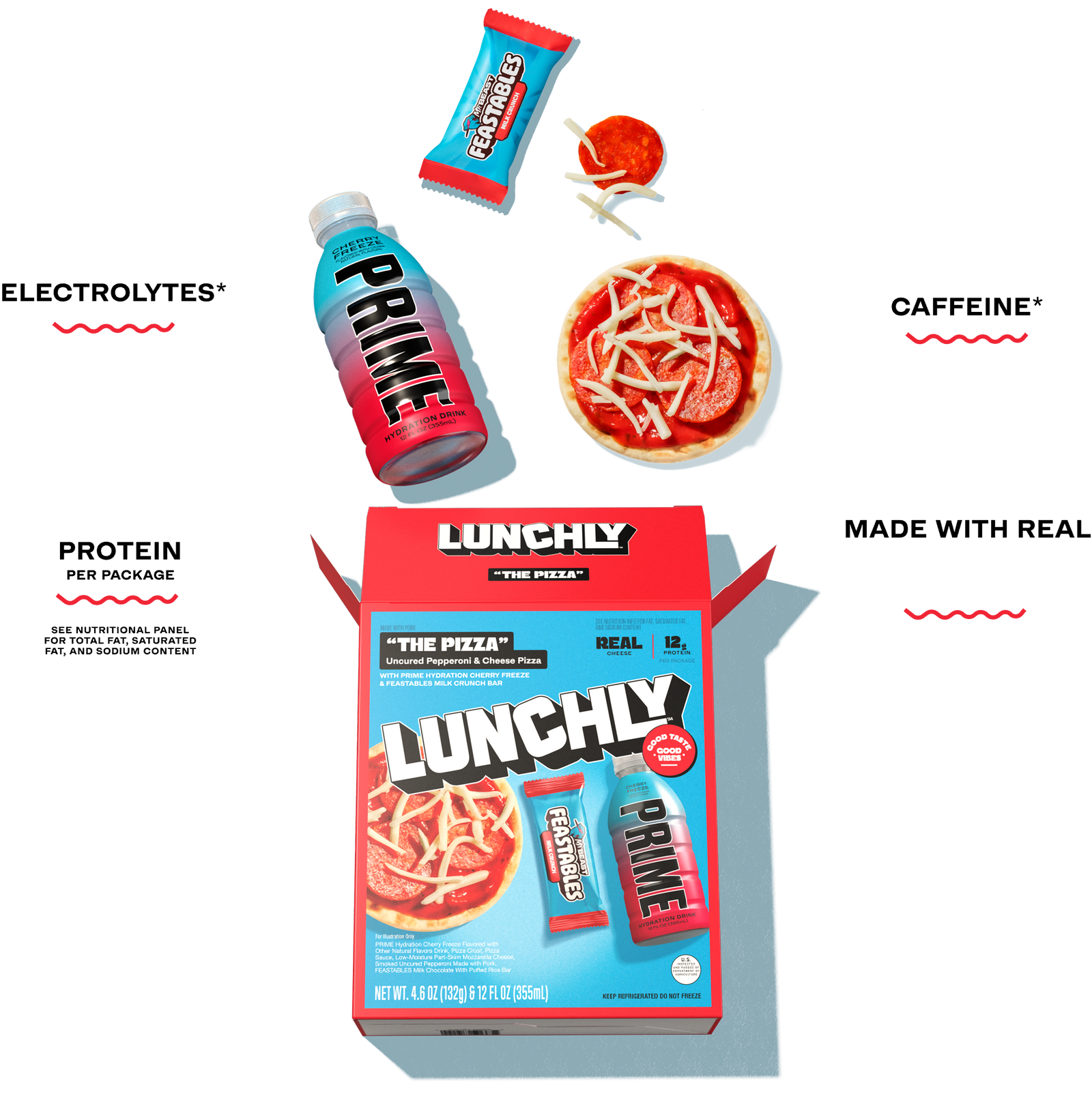 The party you earned. The ingredients you deserve. Enter the one, the only—"The Pizza." Crafted with premium, toppings you can trust, each LUNCHLYTM box brings you 12g of protein per package and 400mg of electrolytes per PRIME Hydration. No secrets in our sauce – just bold bites and good vibes.